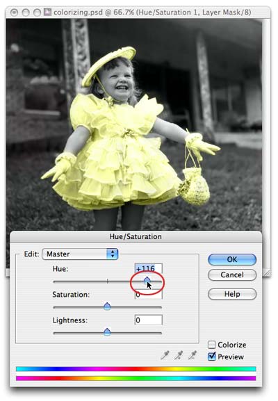 Jika anda ingin merubahnya menjadi warna lain, klik layer 1 ( layaer warna ) lalu tekan button Adjustment Layer yang berada di bawah (sebelah kanan layer mask) atau lewat toolbar : Image > Adjustments >Hue/Saturation…